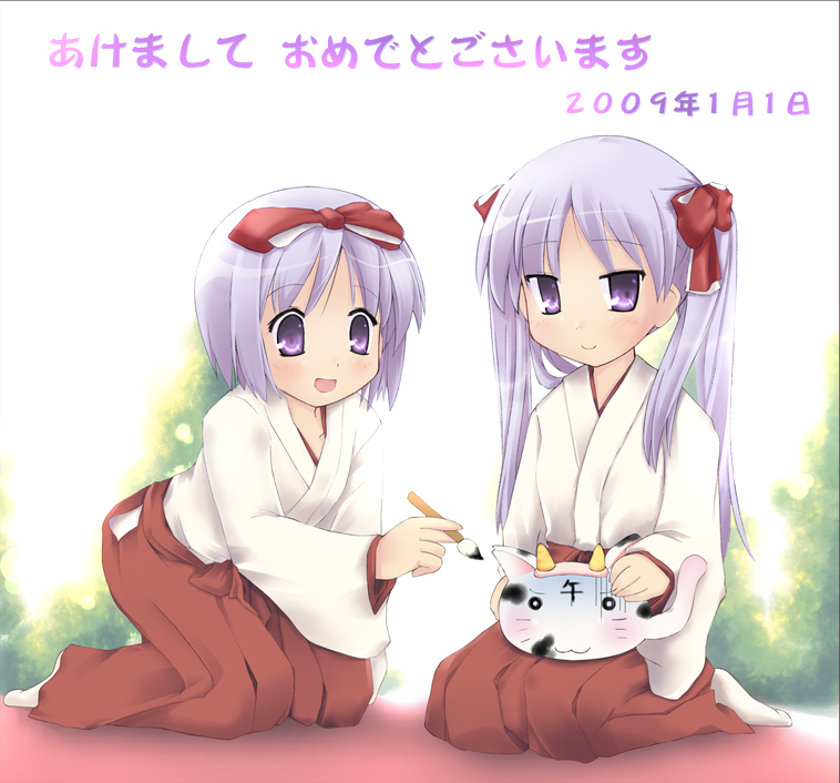 :300s20092girlsakeomeanimal printbowcalligraphy brushcatcatheadcollarbonecow printhair bowhair ribbonhairbandhakamahakama skirthappy new yearjapanese clotheslong hairmikomultiple girlsnew yearpaintbrushpurple eyespurple hairred hakamaribbonseizashort hairsiblingssisterssittingskirtsmiletaremetsurimetwinstwintails