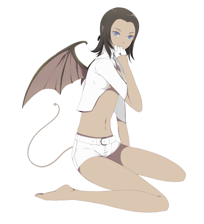 1girlbarefootbat wingsbeltbrown hairdark skindark-skinned femalefeetfemale focusmidriffshort hairshort shortsshortssolotailwhite shortswings