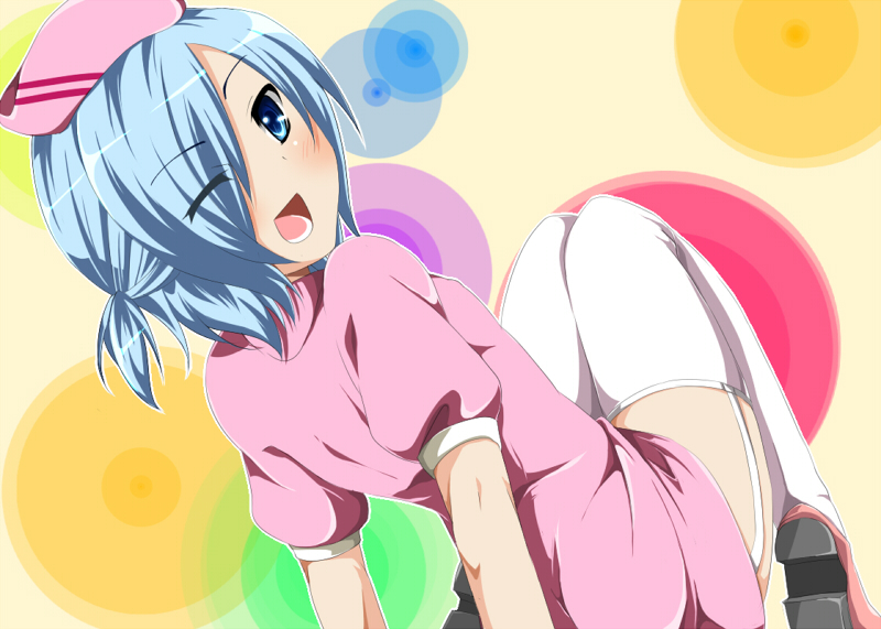beretblue eyesblue hairgarter strapshatlooking backmale focusnurseone eye closedopen mouthsolothighhighstrapwink