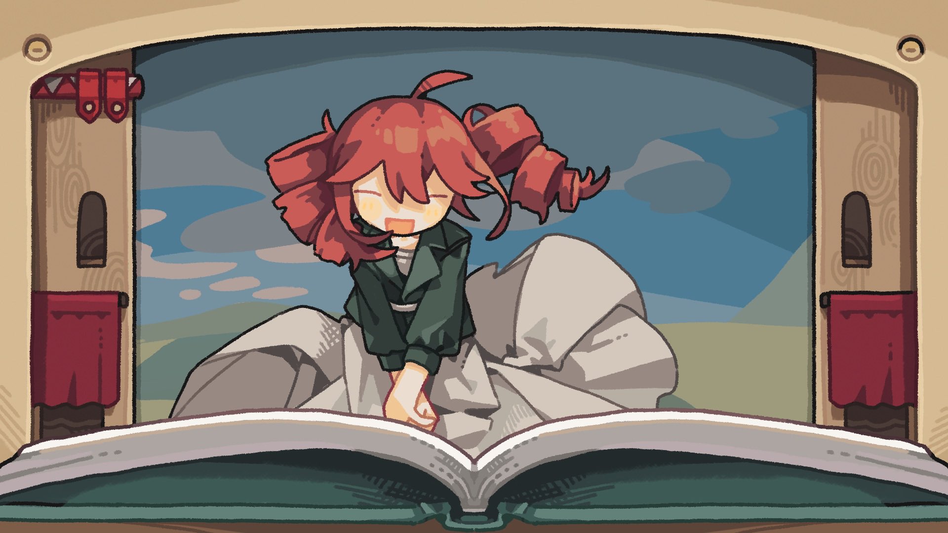 :d1girlahogeblush stickersbookclosed eyesdaydrill hairgreen shirtlong sleevesopen bookopen mouthoutdoorsred hairshirtshort hairskirtsmilesolostandingtwin drillswhite skirt