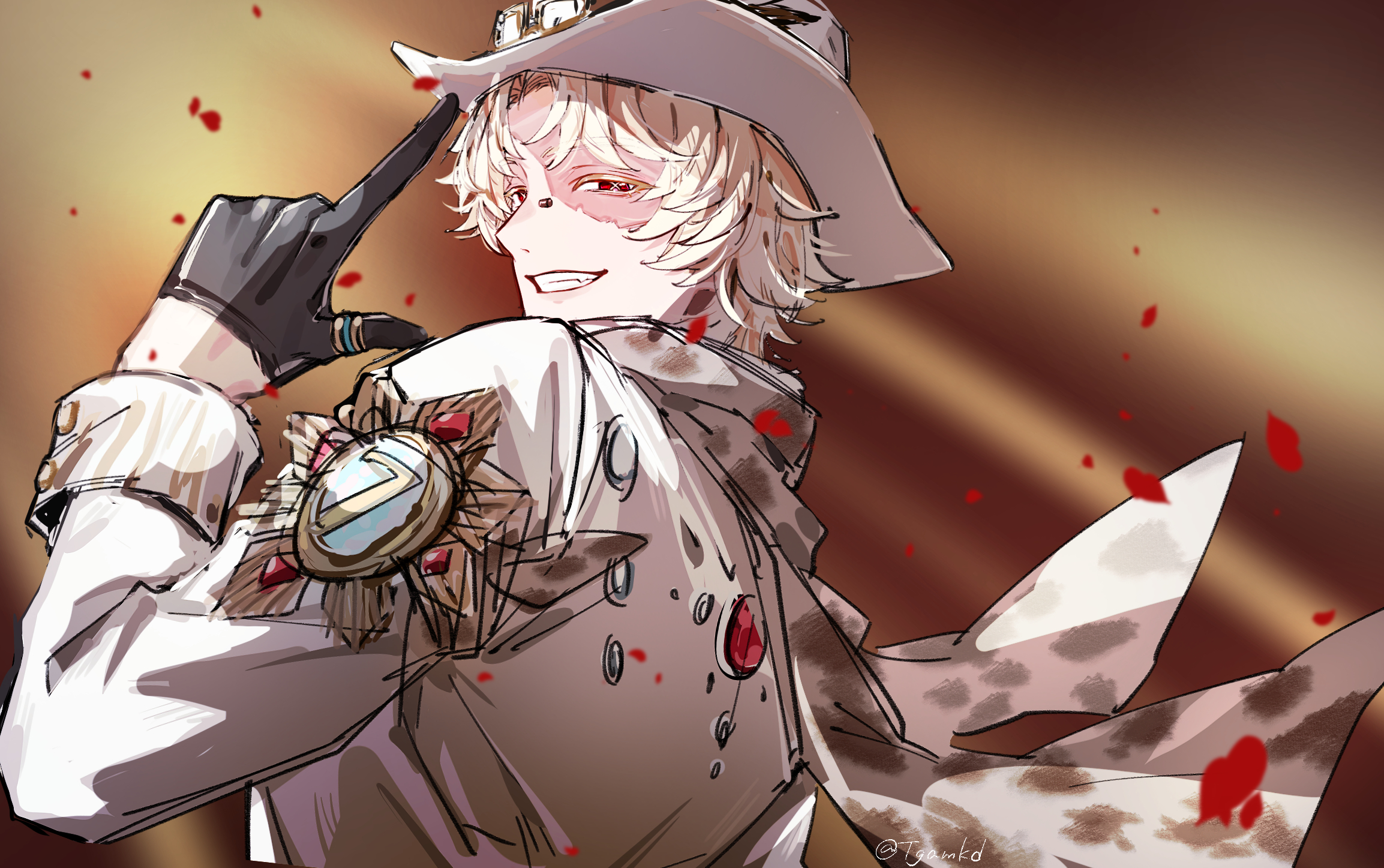 1boyblack glovesblonde hairbridge piercingcolored eyelashescowboy hatface piercingfangfloating clothesgloveshalf gloveshalf-closed eyeshatjacketlooking at viewerlooking backmale focusnorton campbell (dazzling lone wolf)piercingred eyesscarscar across eyescar on facescarfsmirkuser enke5758white jacket
