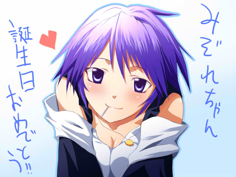 00s1girlblushbreastscandycleavagefemale focusfoodheartjewelrylollipopmedium breastsnecklaceoff shoulderpurple eyespurple hairshort hairsolo