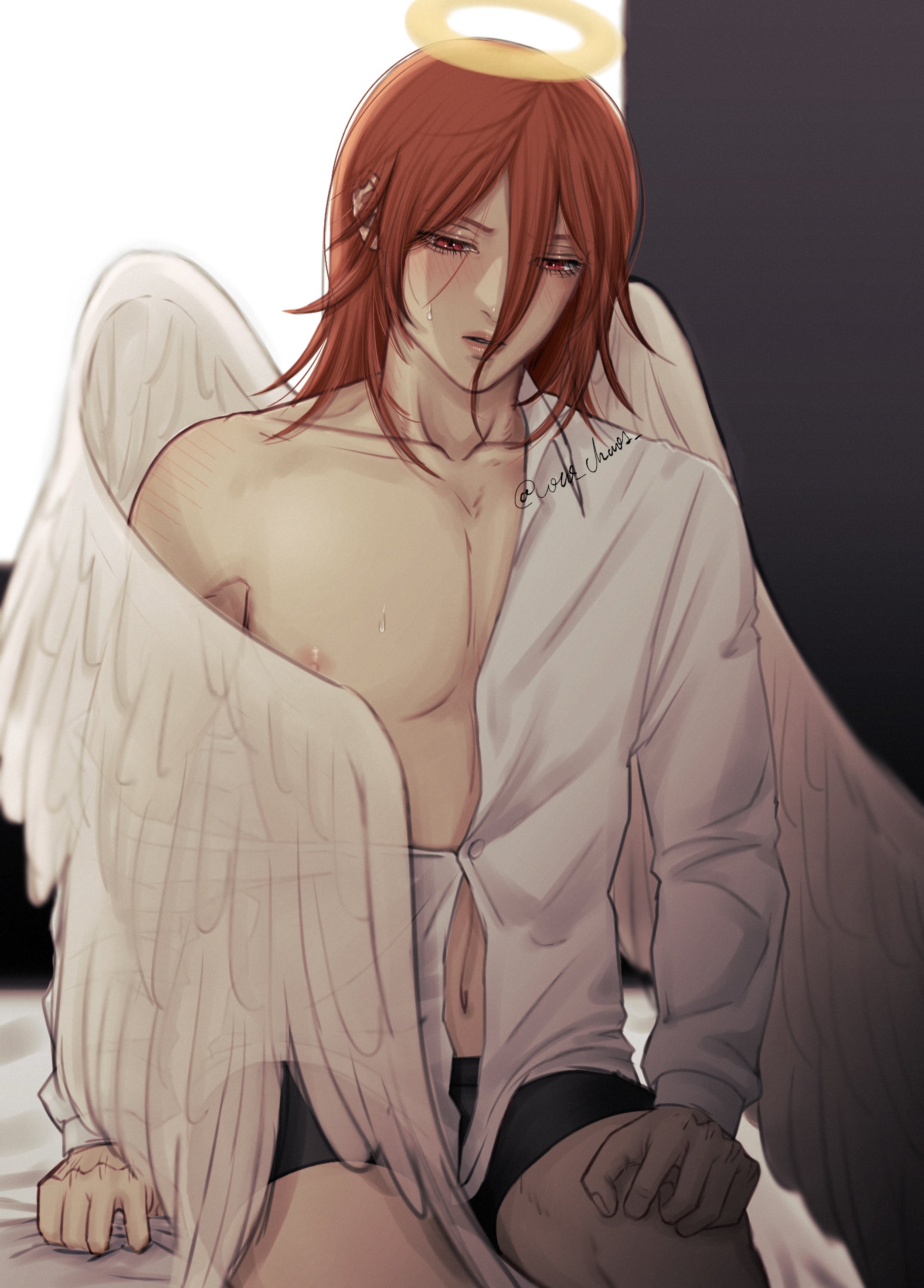 1boyangelangel wingsaya (coco chaos)bed sheetblack pantiescollarbonecollared shirtfeathered wingshair between eyeshalolipslong hair between eyeslong sleeveslooking at viewermale focusmale underwearnavelnipplesorange eyesorange hairpantiesparted lipspartially unbuttonedpectoralsshirtsittingsolosweattraditional halotwitter usernameunderwearwhite shirtwhite wingswings