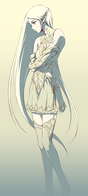 1girlelffantasyfemale focusgarter beltgradient backgroundlong hairmonochromepointy earssolothighhighsvery long hairyellow theme