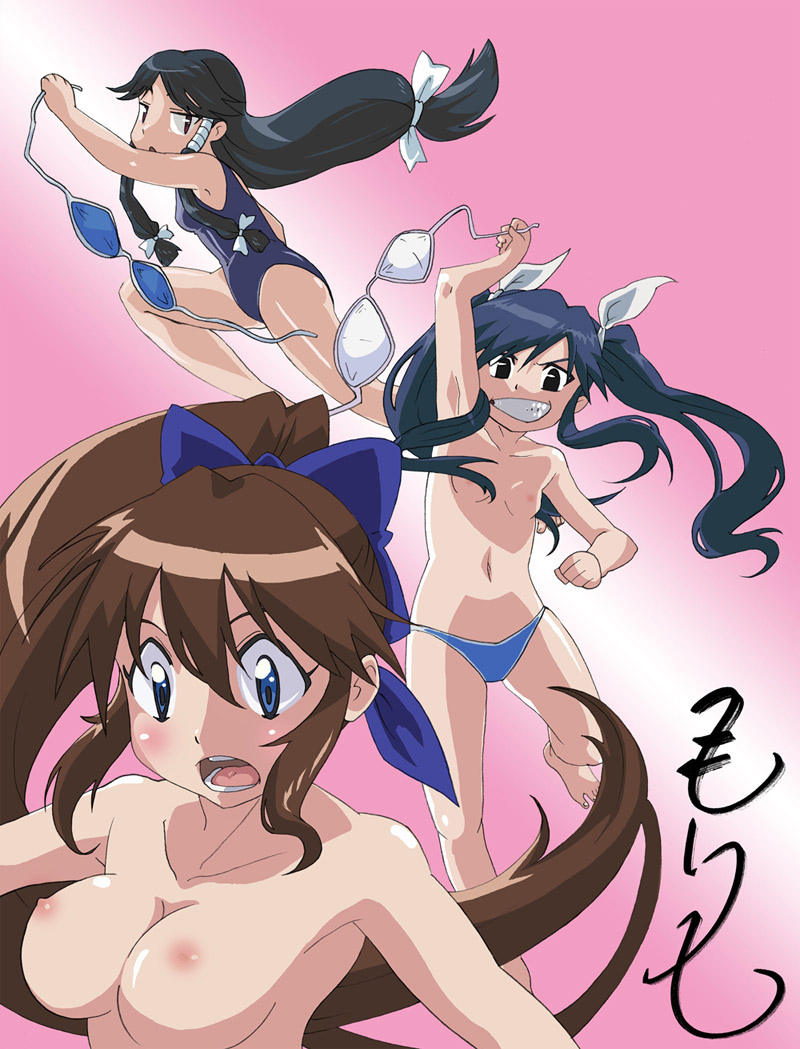 haganemaru kennosuke, 00s, 1girl, 2005, arms under breasts, blush, bow, bow bra, bra, breasts, brown eyes, brown hair, cleavage, collarbone, february, frown, glasses, heart, high ponytail, lingerie, long hair, long sleeves, looking at viewer, medium breasts, navel, off shoulder, open clothes, open mouth, open shirt, pink background, plaid clothes, plaid skirt, ponytail, red skirt, school uniform, shirt, simple background, skirt, standing, striped background, thighs, underwear, white bra, white shirt