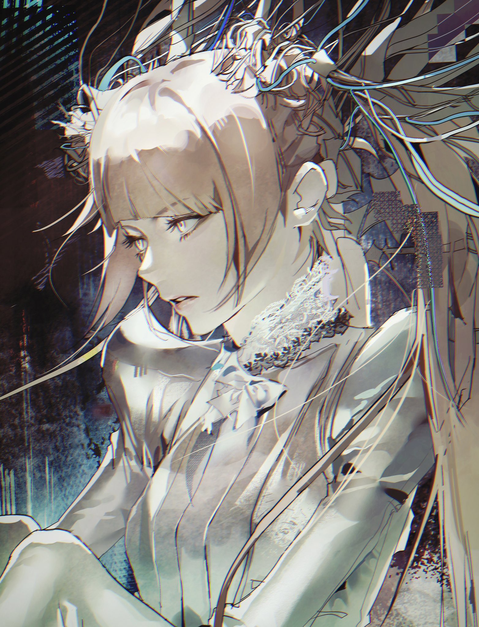 1girlanimificationbreastscablefloating hairfrom sideglitchgrey hairgrey pantyhosegrey shirthair behind earhinata (xg)long hairlong sleeveslooking aheadpantyhoseparted lipspink lipsshirtsittingsmall breastssoharavinsolotwintailsvery long hairxg (group)yellow eyes