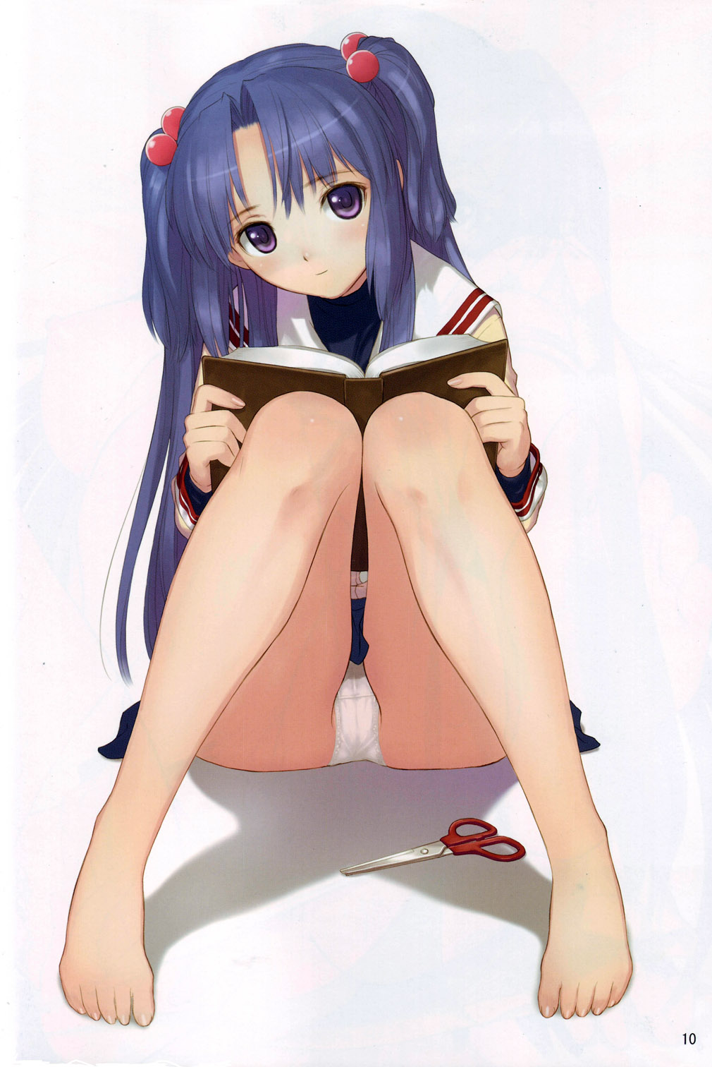 barefootbleed throughblue hairbookfeethair bobbleshair ornamentlong hairpantiespantyshotpurple eyesschool uniformscissorsskirtsmiletwintailsunderwear