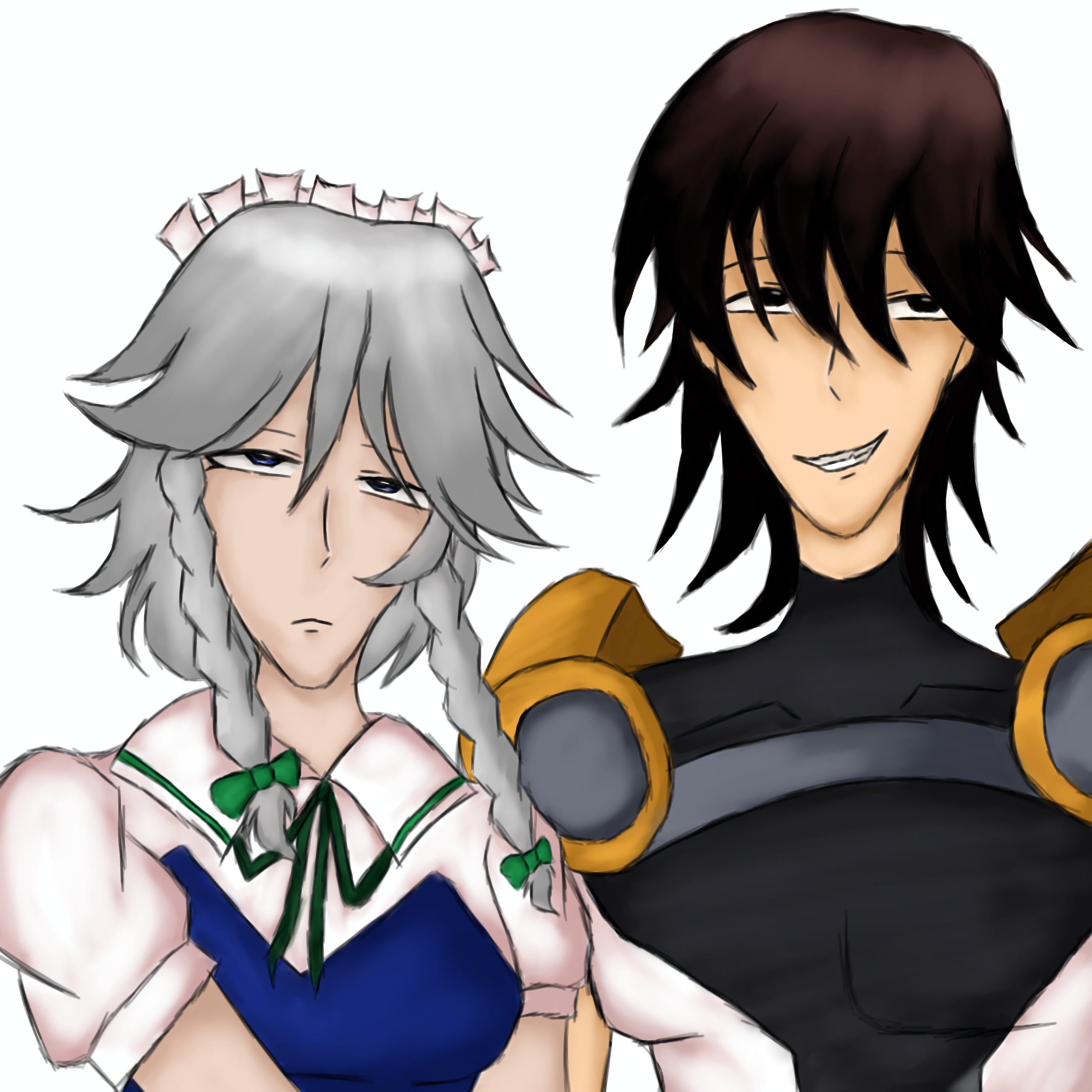 1boy1girlapronblack eyesblack hairblue dressblue eyesbodysuitbraidbreastsbreylyn.xclosed mouthdressgreen ribbongrey hairindonesian commentarymaidmaid headdressribbonsmilespiked hairsuperhero costumeteethtwin braidstwintails