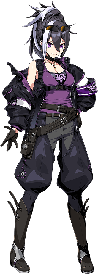 1girlarmbandbeltblack chokerblack hairblack jacketbootsbreastsbrown beltbrown bootschokercleavageclosed moutheyewear on headgrey hairhair between eyeshigh ponytailjacketjewelrykyouka (duel masters play's)multicolored hairnecklaceopen clothesopen jacketpantsponytailpurple eyespurple tank topsolosunglassestank toptransparent background