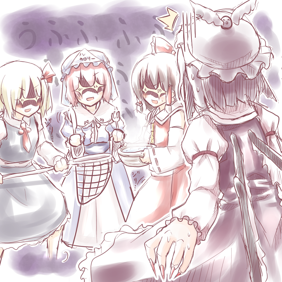 1boy4girlsblonde hairbutterfly netdressfemale focusfoodforeshorteninghand nethatmultiple girlsnetred eyesskirtyou gonna get raped