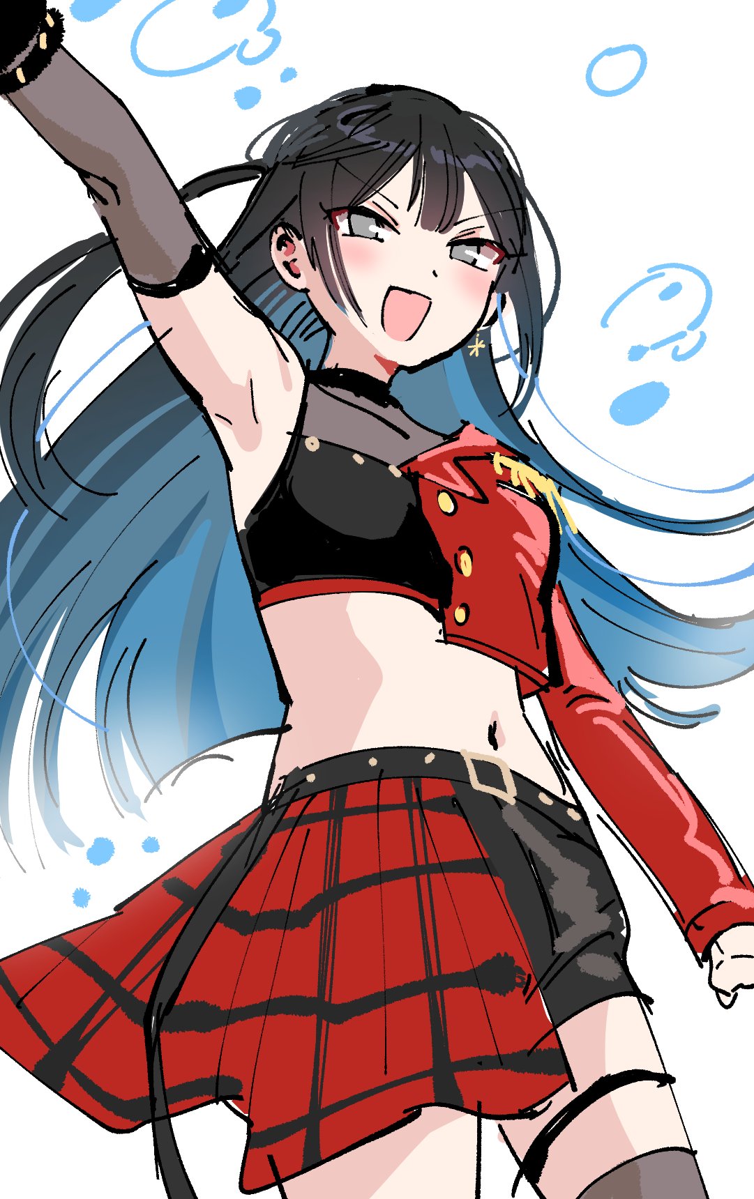 xiacheng tatsuya, fie claussell, eiyuu densetsu, sen no kiseki, sen no kiseki (series), sen no kiseki iii, artist name, black gloves, black socks, crop top, cropped jacket, curtained hair, elbow gloves, fingerless gloves, floating hair, floating scarf, gloves, green eyes, hair between eyes, long hair, looking at viewer, midriff, navel, over-kneehighs, parted bangs, scarf, shorts, simple background, smile, socks, thighhighs, white background, white hair