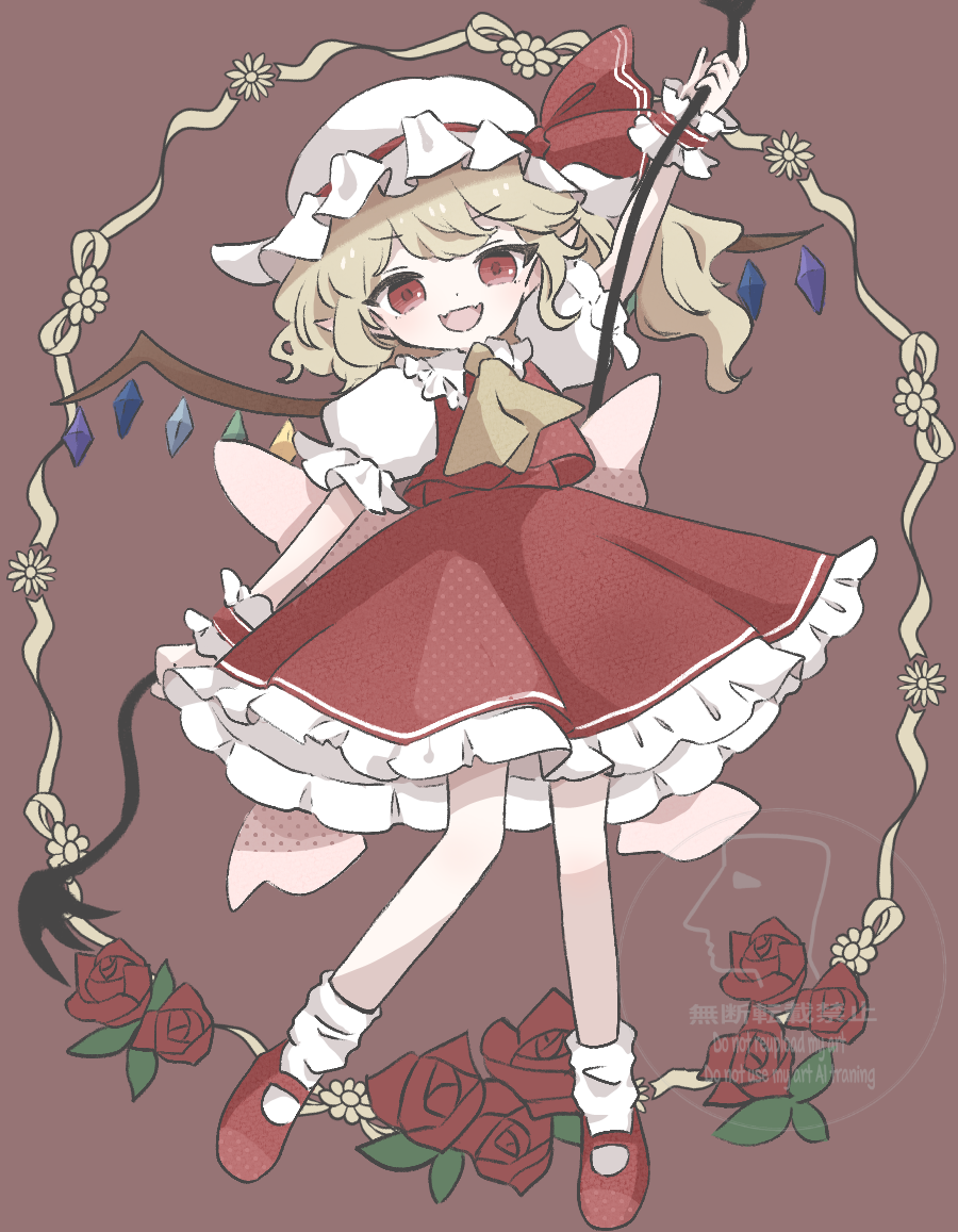 1girlascotblonde hairbobby sockscrystalcrystal wingsflowerfull bodyhathat ribbonlaevatein (touhou)looking at viewermary janesmob capopen mouthpuffy short sleevespuffy sleevesred eyesred flowerred skirtred vestribbonroseshirtshoesshort sleevesside ponytailskirtsmilesockssolovestwingsyellow ascot