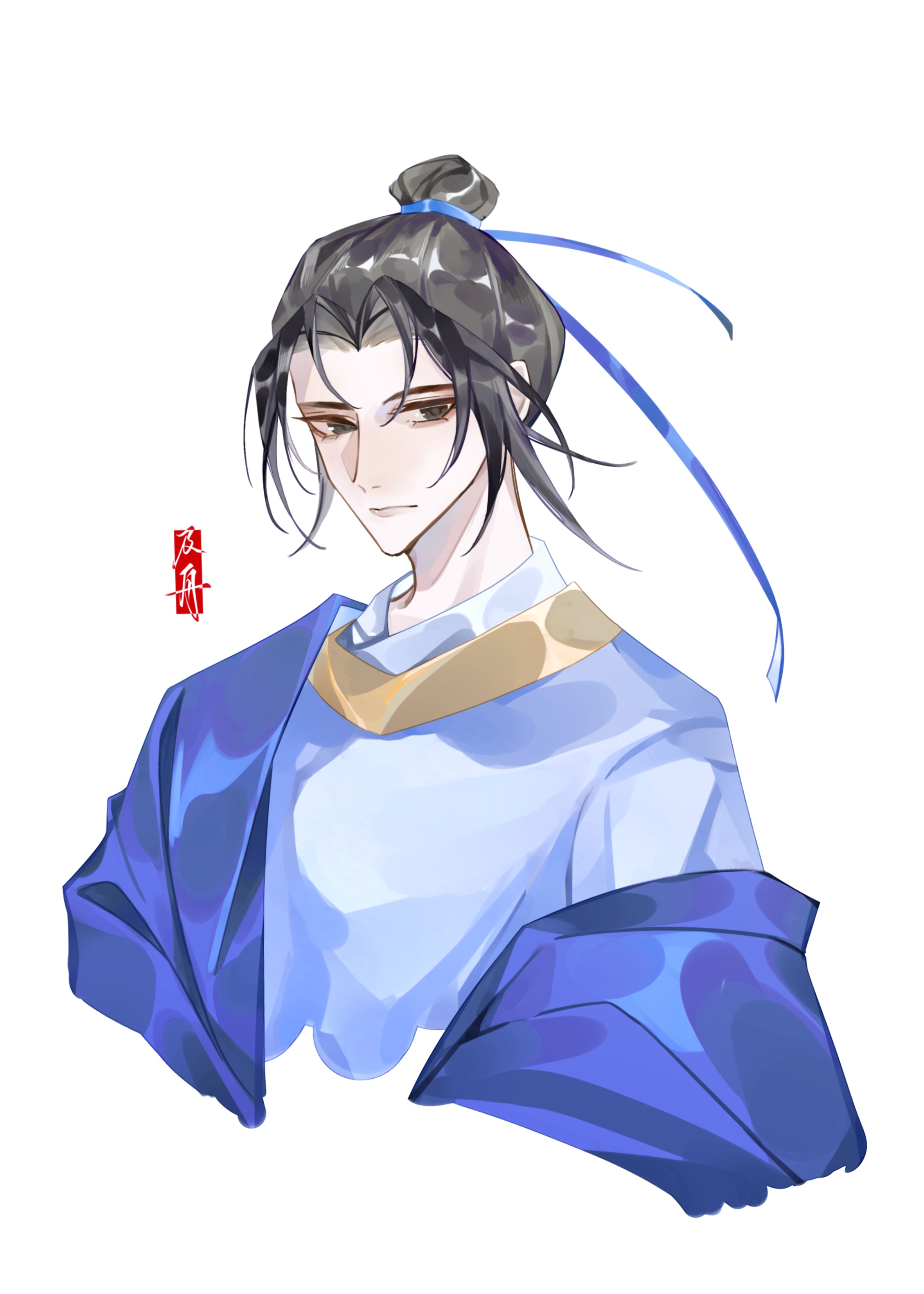 1boyblack eyesblack hairblue hanfublue jacketblue ribbonchinese clothesclosed mouthcropped torsocurtained hairexpressionlesshair bunhair ribbonhanfujacketlooking at viewermale focusoff shoulderopen clothesopen jacketparted bangsribbonseal impressionsimple backgroundsingle hair bunsolowhite backgroundya ji zhouyuanlingpao