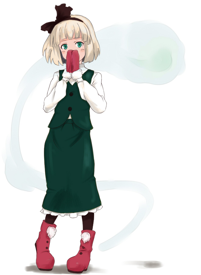 1girlblack pantyhoseblunt bangscovering own mouthfemale focusgreen eyeshairbandhitodamamittenspantyhosered mittensribbonshort hairsimple backgroundsolo