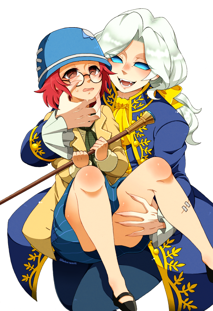 :d1boy1girlartist nameascotblack shoesblue coatblue eyesblue hatblue sclerablue skirtbowcanecoatcolored scleraconvenient legfangsglassesgold trimhair bowhand around neckhatlong hairno pupilsopen mouthponytailred hairshoesskirtsmilesolid eyessweatwavy hairwhite hairyellow ascotyellow bowyellow coat