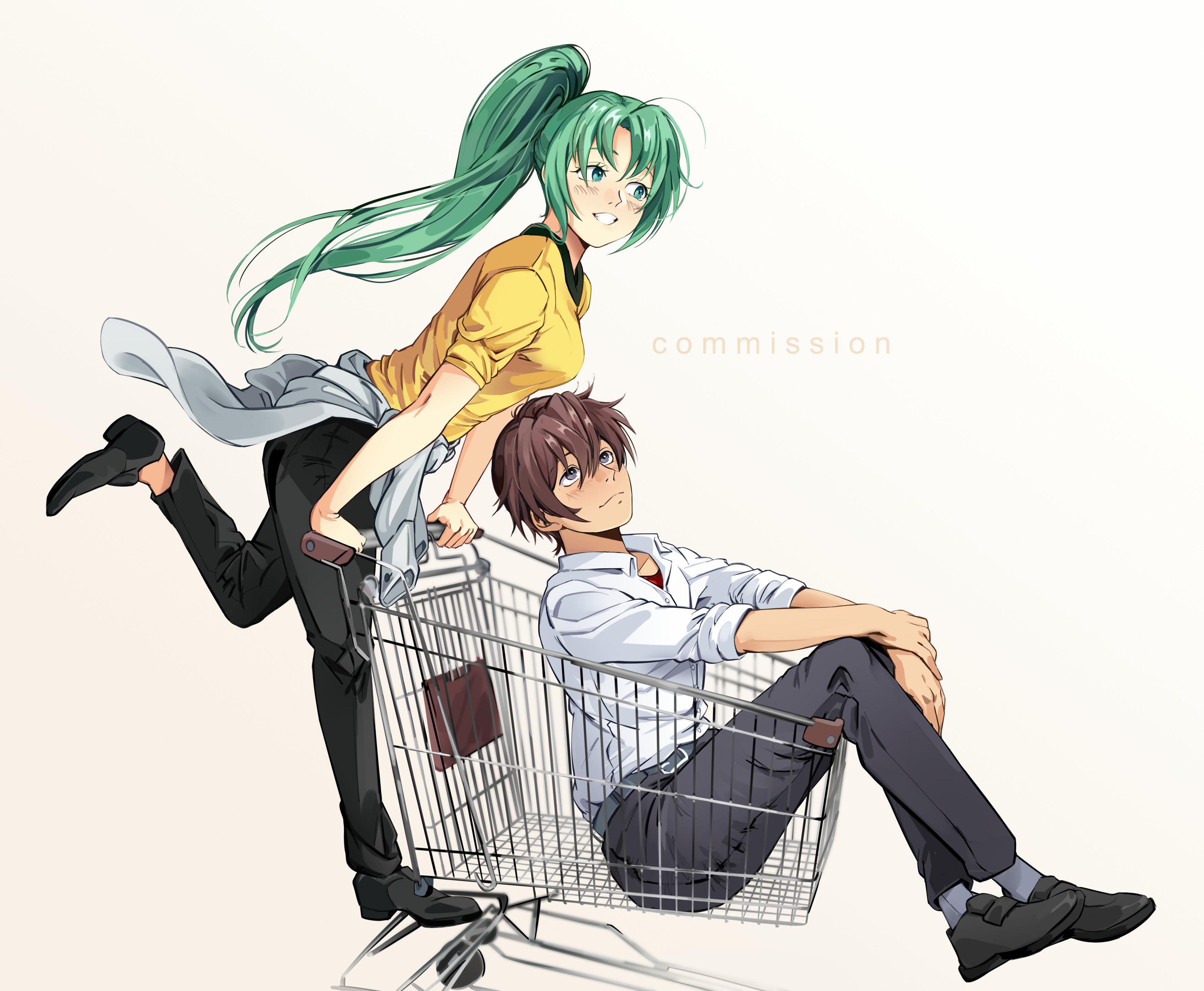 1boy1girlblack pantsblack shoesblue eyesblushbreastsbrown hairclothes around waistgreen hairin shopping cartjacketjacket around waistlong hairpantsponytailpushing cartshirtshoesshopping cartshort hairsmilewhite jacketwhite shirtyellow shirt