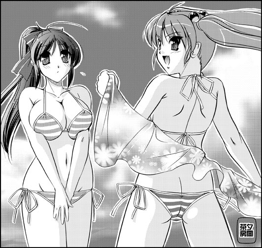 2girlsassbikinibreastsbreasts squeezed togethergreyscalelarge breastslong hairmedium breastsmonochromemultiple girlsponytailside-tie bikini bottomstring bikiniswimsuittoweltwintails