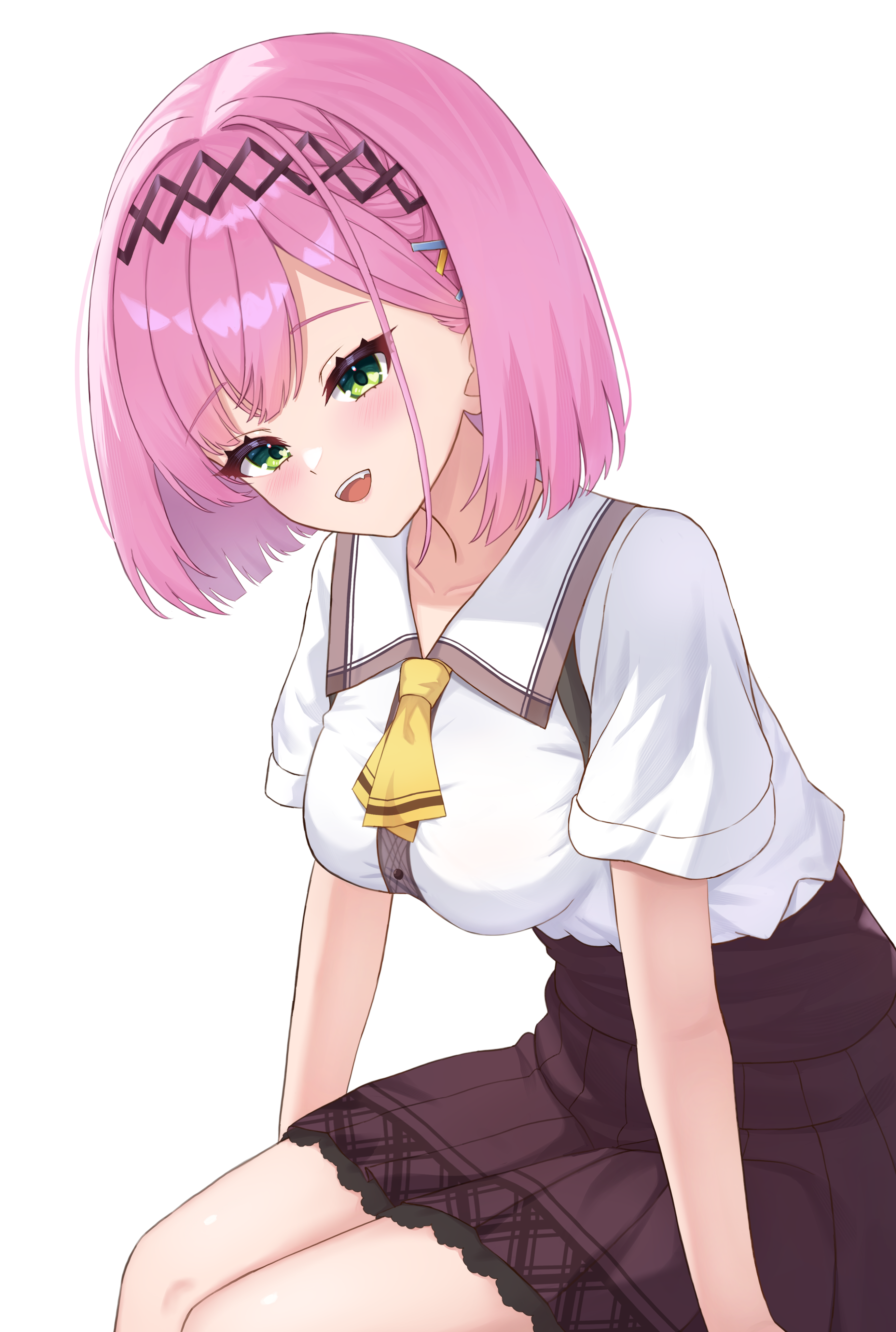 :d1girlblack hairbandblunt endsblushbob cutbreastsbrown skirtcollarbonecollared shirteyelashesfangfeet out of framefrilled skirtfrillsgreen eyeshair between eyeshair ornamenthairbandhaircliphigh-waist skirtlarge breastsleaning forwardlooking at viewermedium hairmizuka academy school uniformnecktieopen mouthpink hairschool uniformshirtshort necktieshort sleevessimple backgroundsittingskirtsmilesolosuspender skirtsuspendersteethupper teeth onlywhite backgroundwhite shirtx hair ornamentyellow necktie