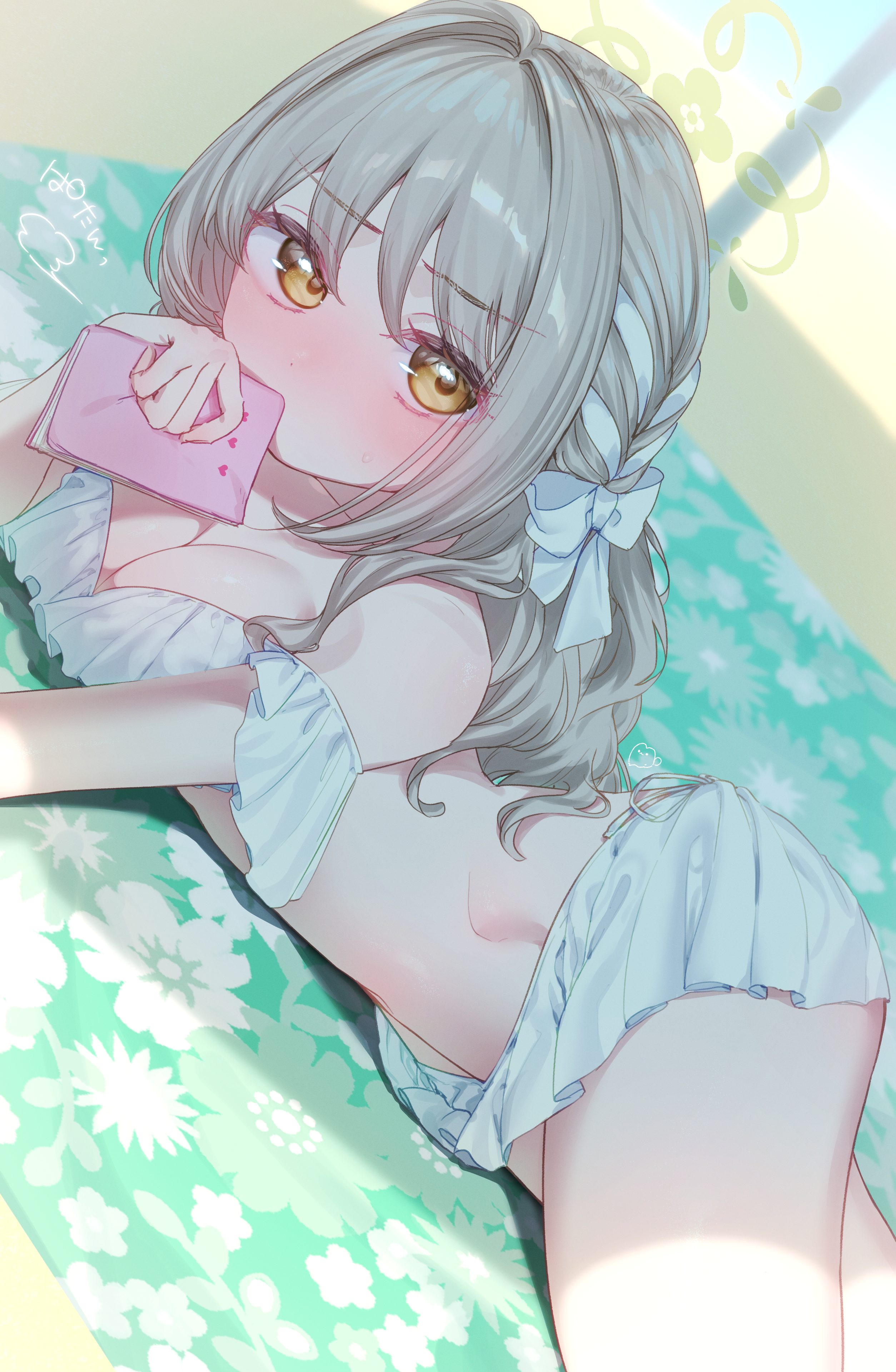 1girlalternate costumebeachbeach towelbikinibowbraidchoppy bangscovering own mouthfrilled bikinifrillsgreen halohair ribbonhaloholdingholding notebooklong hairlooking at viewerlyingnotebookon stomachribbonribbon braidsoloswimsuittowelwhite bikiniwhite bow