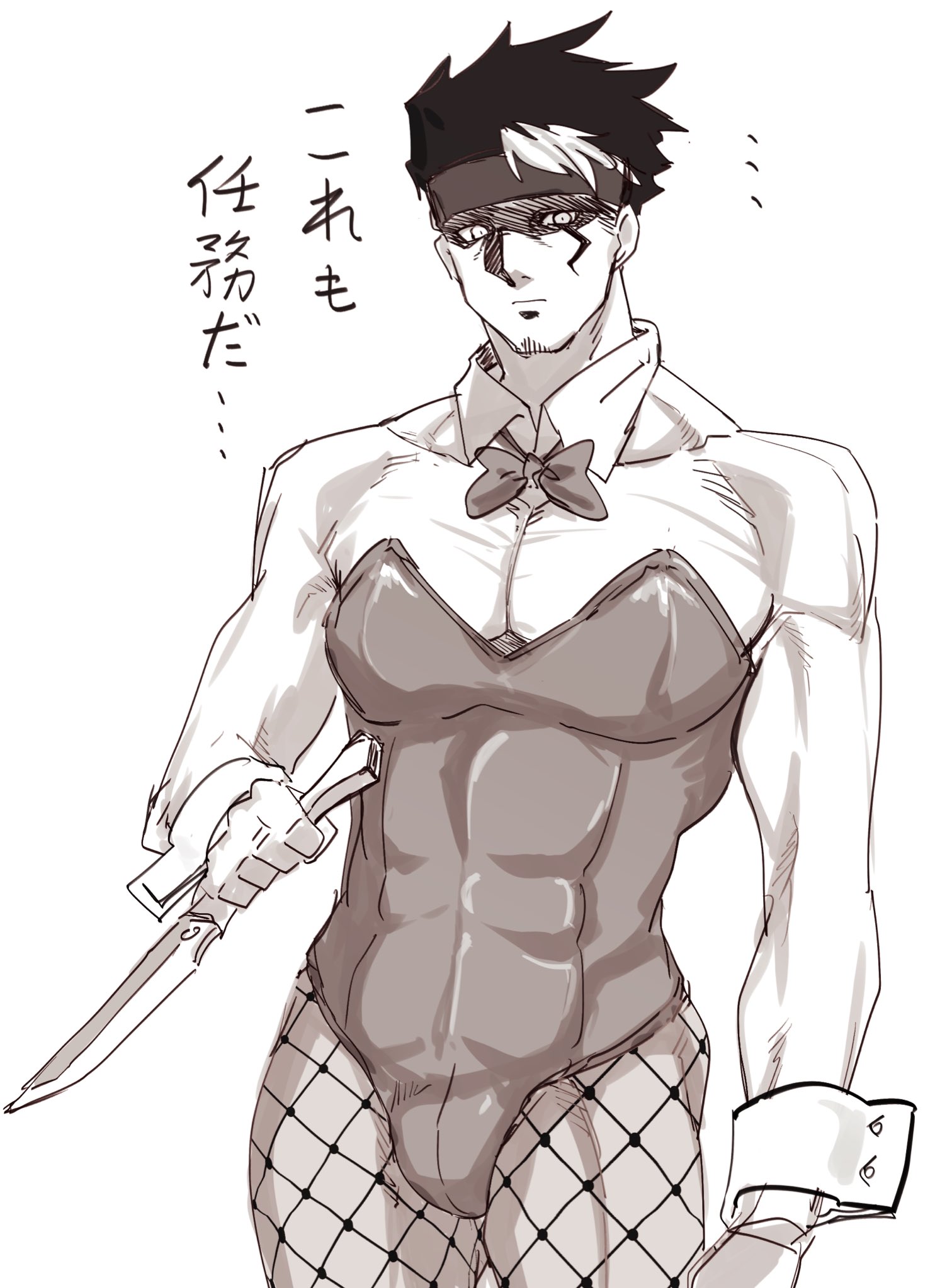 1boybreastsbunny daycleavagedetached collarfishnet pantyhosefishnetsfujino moroyokiheadbandholdingholding knifeknifeleotardmale focusmonochromemulticolored hairmuscularmuscular malepantyhoseplayboy bunnyshaded faceshort hairsketchsolostreaked hairwrist cuffs