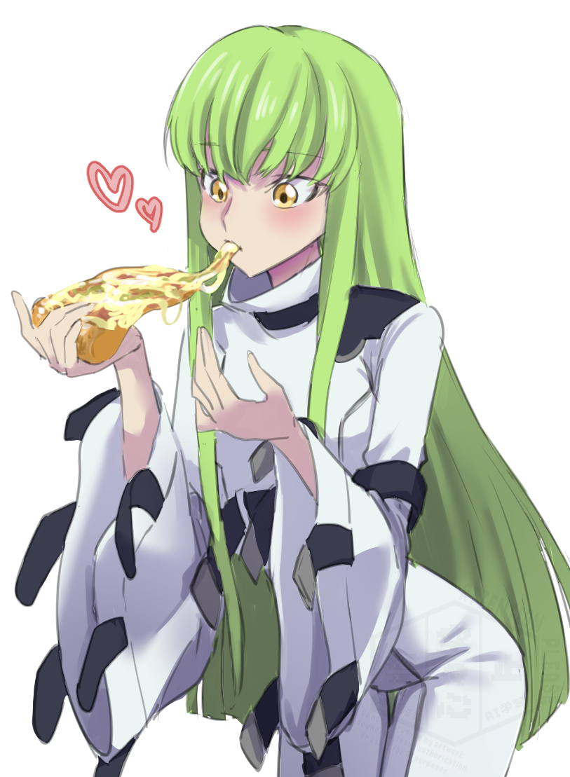 1girlblushbodysuiteatingfoodgreen hairhands upheartholdingholding foodholding pizzalooking at foodpizzasimple backgroundsolowhite backgroundwhite bodysuitwide sleevesyellow eyes