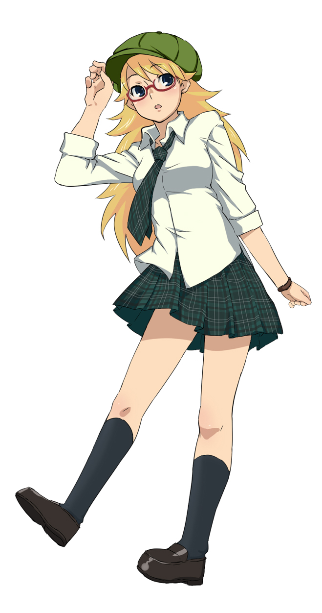 mizoguchi keiji, flandre scarlet, touhou, 1girl, blonde hair, character name, female focus, frilled sleeves, frills, hat, mob cap, necktie, orange hair, puffy short sleeves, puffy sleeves, red eyes, red skirt, shadow, shirt, short sleeves, side ponytail, skirt, skirt set, solo, thumbs down, white background, white shirt, wings, yellow necktie