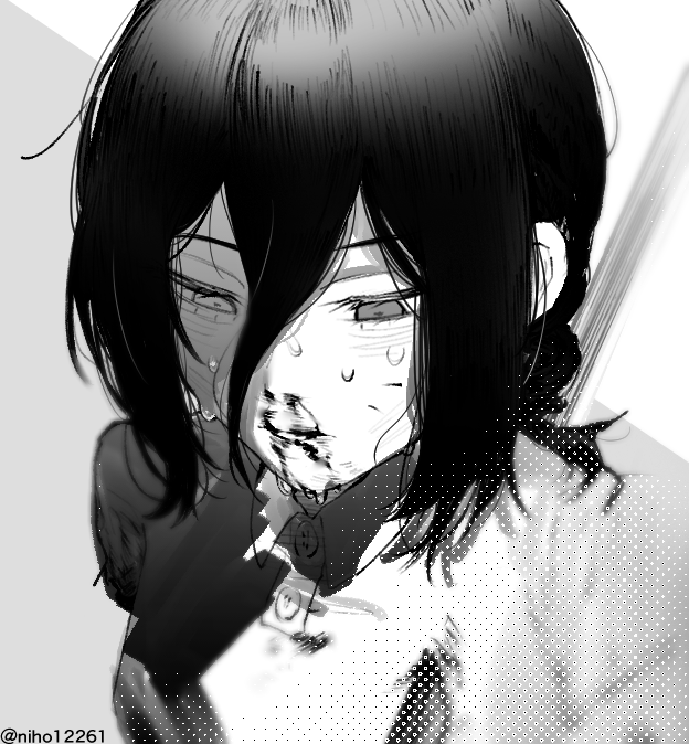 1girlbloodblood on facegreyscalehair between eyesimpaledimplied deathmonochromenihoni (fszh3584)nosebleedpolo shirtsolosweat