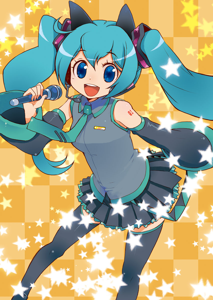 :d1girlanimal earsaqua hairblue eyesblue haircheckered backgrounddetached sleevesfemale focusheadsetlong hairlooking at viewermatching hair/eyesmicrophonenecktienumber tattooopen mouthshoulder tattooskirtsmilesolostar (symbol)tattoothighhighstwintailszettai ryouiki