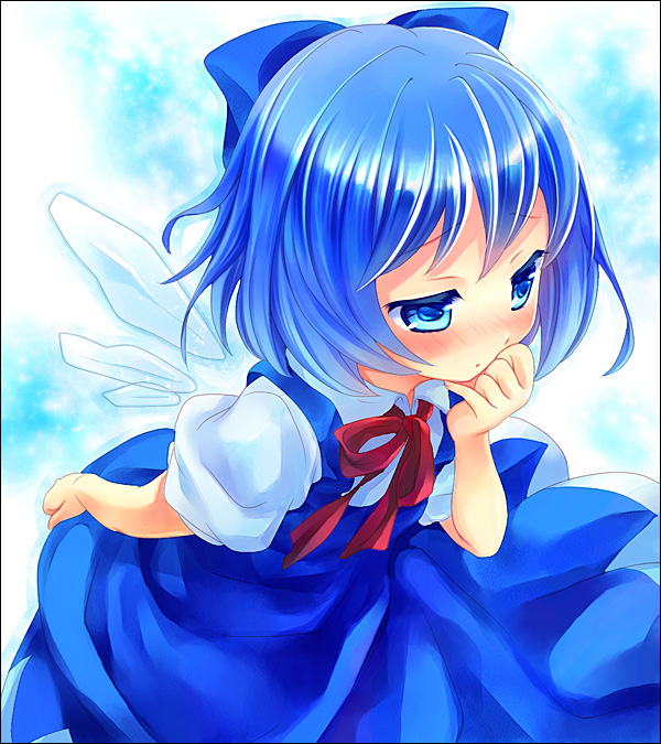 1girlblue bowblue dressblue eyesblue hairblue themeblushbowchildcollared shirtdressfemale focusgradient backgroundhair bowhand on own chiniceice wingsmatching hair/eyesneck ribbonpuffy short sleevespuffy sleevesred ribbonribbonshirtshort hairshort sleevessimple backgroundsolowhite backgroundwhite shirtwings