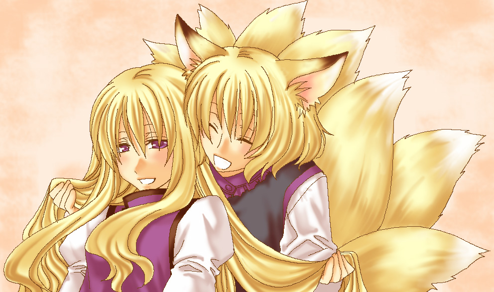 k hiro, suzumiya haruhi, tsuruya, suzumiya haruhi no yuuutsu, 00s, 2girls, breasts, brown hair, female focus, gradient background, long hair, maid, multiple girls, pantyhose, short hair, standing, very long hair