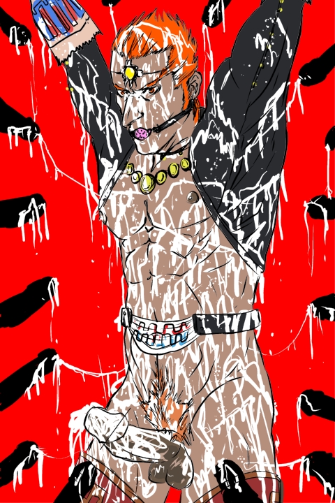 keith royal, orphen, majutsushi orphen, highres, scan, 2boys, black hair, fingerless gloves, gloves, headband, male focus, multiple boys