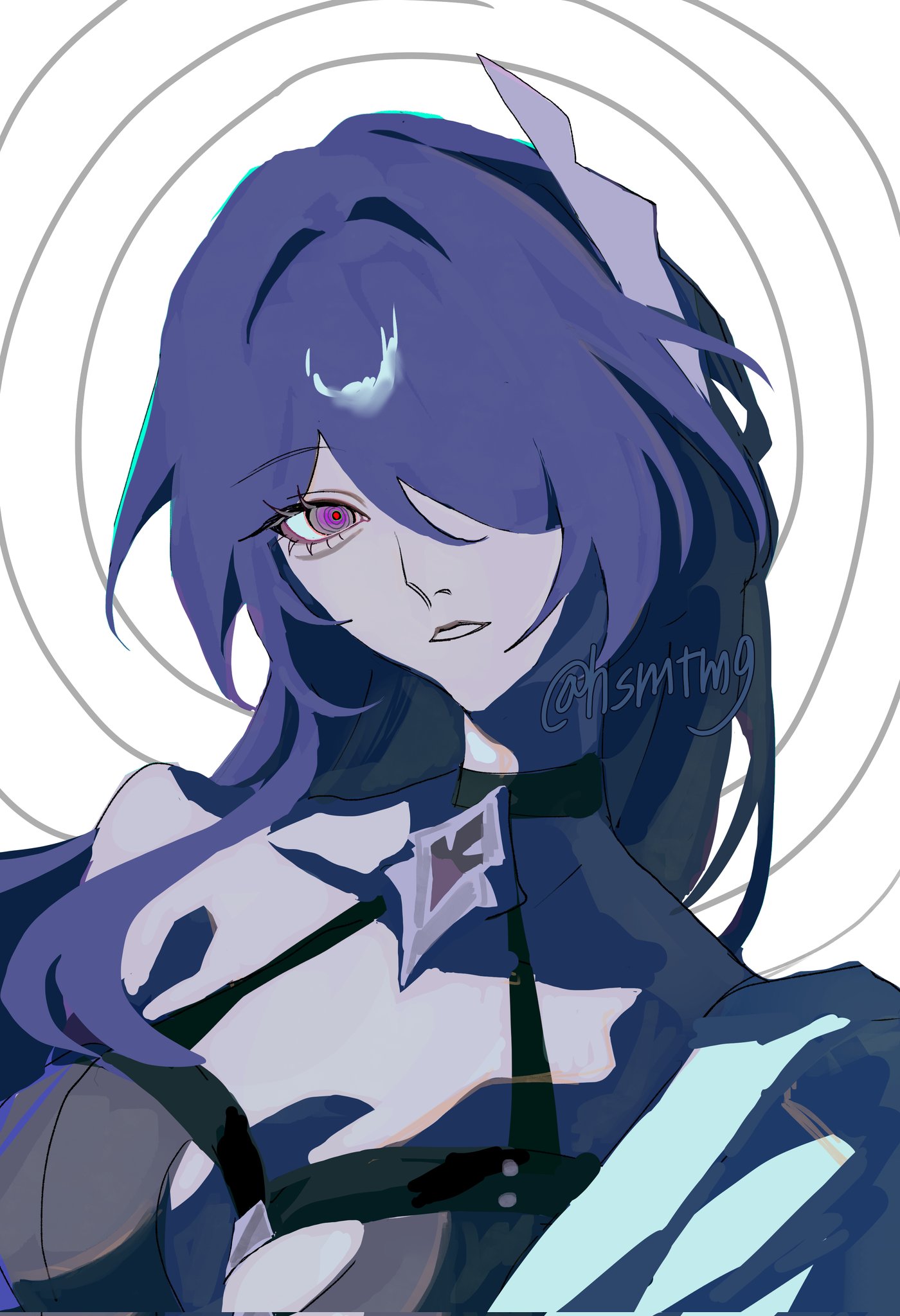 1girlchokercrop tophair ornamenthair over one eyejacketlong hairlooking at vieweropen clothesopen jacketparted lipspurple eyesred pupilssingle bare shoulderspaghetti strapvery long hairwhite background