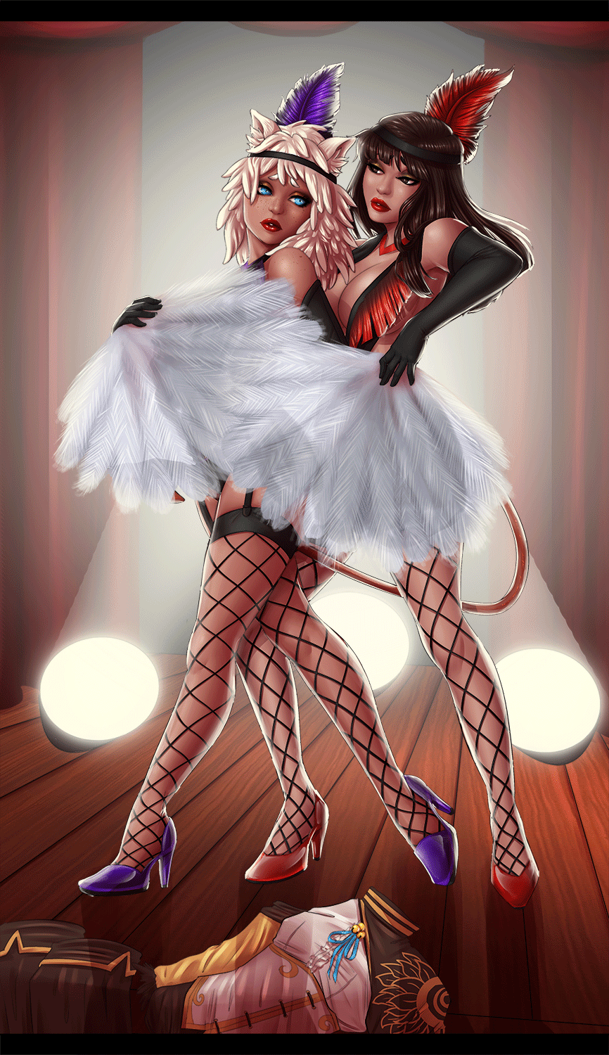 2girlsanimal earsblue eyesbreast grabbreastsbrown eyesbrown haircleavageelbow glovesfemalefishnetFlag for Deletiongarter strapsgloveshigh heelslarge breastslong hairmultiple girlsnipplessheep girlshortsstandingtailthighhighswhite hair