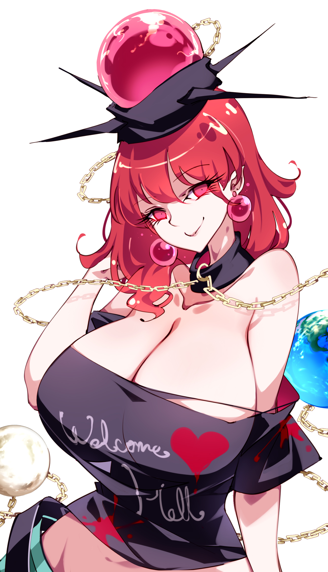 1girlbare shouldersbreastschainchokercleavageclosed mouthcollarboneearth (ornament)hand in own hairlarge breastslong hairlooking at viewermidriffmoon (ornament)off shoulderoff-shoulder shirtplaid clothesplaid skirtred eyesred hairshirtskirtsmilesolot-shirtunderworld (ornament)upper body