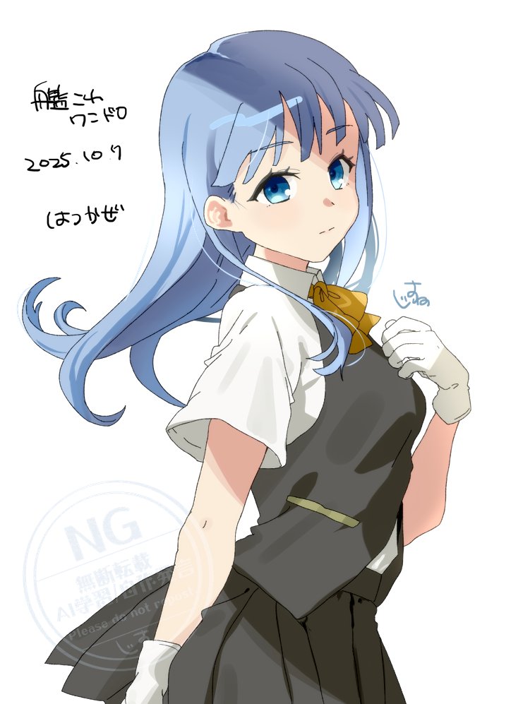 1girlblack skirtblack vestblue eyesblue haircharacter namecollared shirtcowboy shotdateddress shirtgloveslong hairneck ribbonone-hour drawing challengepleated skirtribbonshirtsimple backgroundskirtsolovestwhite backgroundwhite gloveswhite shirtyellow ribbon