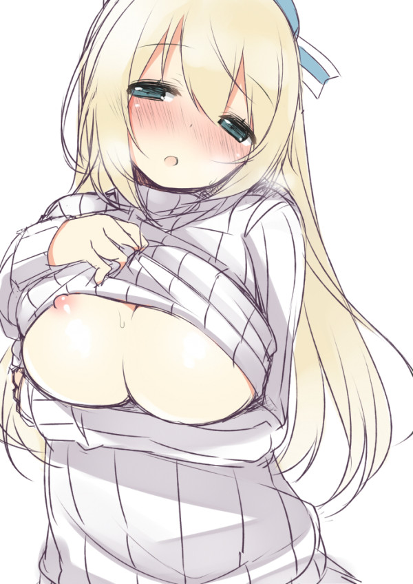 blonde hairblushbreastsfemaleFlag for Deletiongreen eyeslarge breastslong hairlooking at viewernipplespersonificationribbed sweatersweater