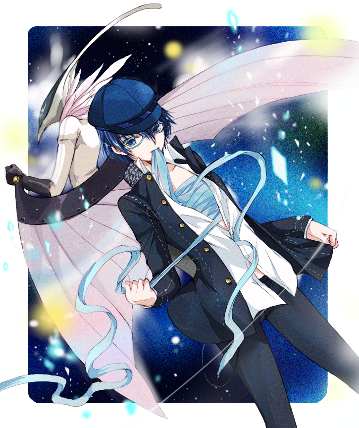 1girlandrogynousblue eyesblue hairbreast bindglasseshatopen clothesopen shirtreverse trapsarashishirtshort hair