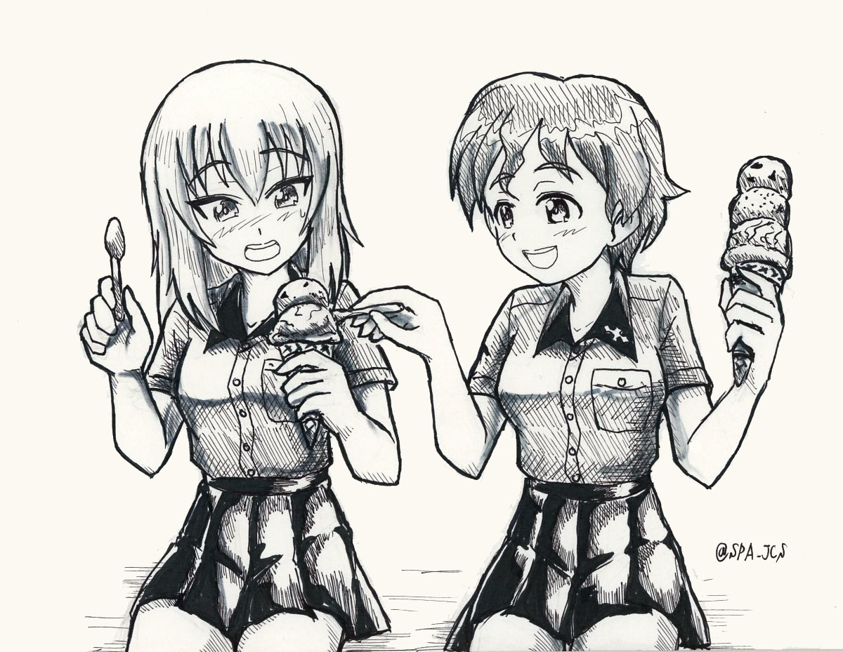 2girlscurly hairfoodholdingholding foodholding ice creamholding ice cream coneholding spoonice creamice cream conekuromorimine school uniformlong hairmultiple girlsopen mouthpanickingschool uniformshort hairshort sleevessmilespoon