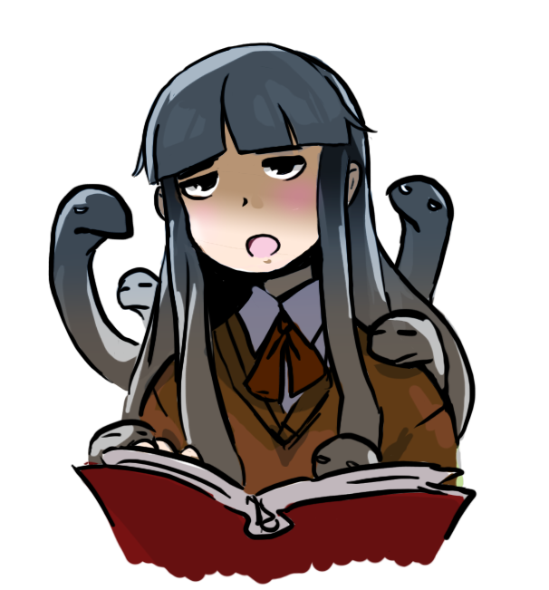 1girlblack eyesblunt bangsblushbookfemale focusjitomeliving hairopen mouthshaded facesimple backgroundsnake hairsolosweatertentacle hairupper bodywhite background
