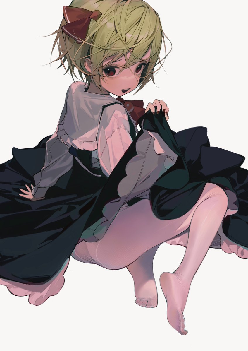 1girlassblack dressblonde haircapeletclothes liftdressdress liftfangfeetfrillshair ribbonlegslong sleeveslooking at viewernail polishneckerchiefno pantiesno shoespantyhoseparted lipsred eyesred nailsred neckerchiefribbonshirtshort hairsittingsmilesoloteeththighsupper teeth onlywhite backgroundwhite capeletwhite pantyhosewhite shirt