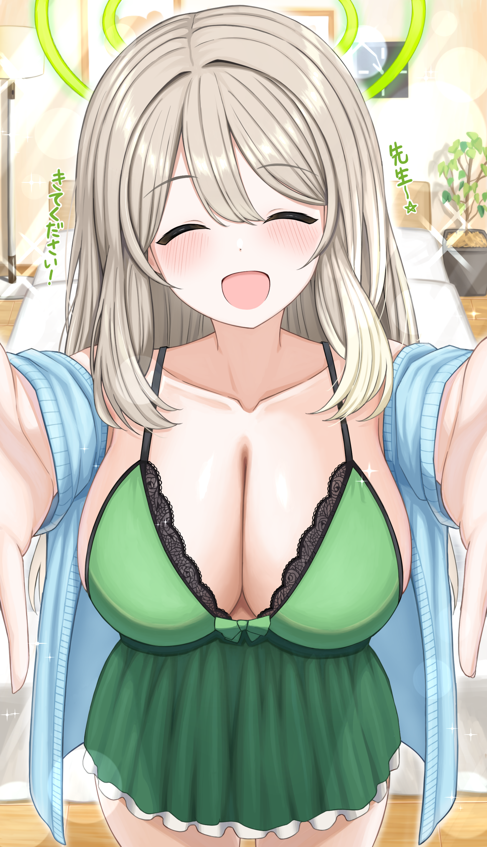 :d1boy1girlalternate costumebabydollbedbedroomblonde hairblue jacketbowbreastscleavageclosed eyescollarbonefacing viewergreen babydollgreen bowgreen halohalohug invitationindoorsjacketlarge breastslight blushlong hairopen mouthoutstretched armsreachingreaching towards viewersmilesolosparkle