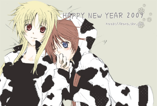 mary1201kmgn, lumine (genshin impact), scaramouche (genshin impact), wanderer (genshin impact), genshin impact, highres, 1boy, 1girl, arm cutout, belt, black belt, black bodysuit, black bow, black corset, black eyes, black gloves, black hair, black shorts, blonde hair, blue cape, blue flower, blue gemstone, blue hat, blue kimono, blue sleeves, blue trim, blunt ends, bodysuit, border, bow, breasts, cape, clear sky, closed mouth, clothing cutout, corset, detached sleeves, dress, elbow gloves, eye contact, eyelashes, eyeliner, eyeshadow, feathers, flower, from side, furisode, gem, gloves, gold, hair flower, hair ornament, half-closed eyes, hand on own shoulder, hand up, hat, hip vent, holding hands, japanese clothes, jingasa, juban, kimono, layered sleeves, looking at another, makeup, mandarin collar, median furrow, medium breasts, multicolored flower, night, night sky, open clothes, open kimono, open mouth, outdoors, partially fingerless gloves, pink flower, pink lips, pom pom (clothes), purple hat, purple rope, purple sash, red eyeliner, red eyeshadow, rope, sash, scarf, short hair, short sleeves, shorts, shoulder peek, sideways mouth, sky, tareme, tassel, teeth, tsurime, two-sided fabric, two-sided headwear, upper teeth only, vambraces, watermark, white border, white dress, white kimono, white scarf, white sleeves, white trim, yellow eyes, yellow feathers
