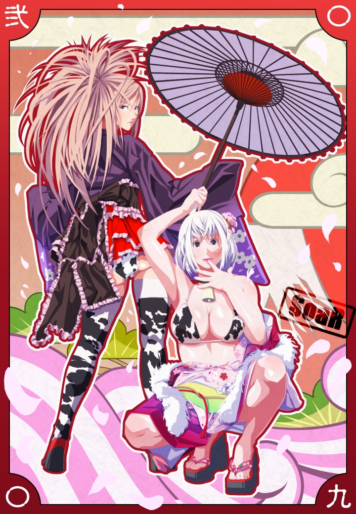 00s20092girlsanimal printbellbikinibikini top onlycow printkneelinglong hairmultiple girlsnew yearoil-paper umbrellapetalsshort hairswimsuitthighhighsumbrellawhite hair