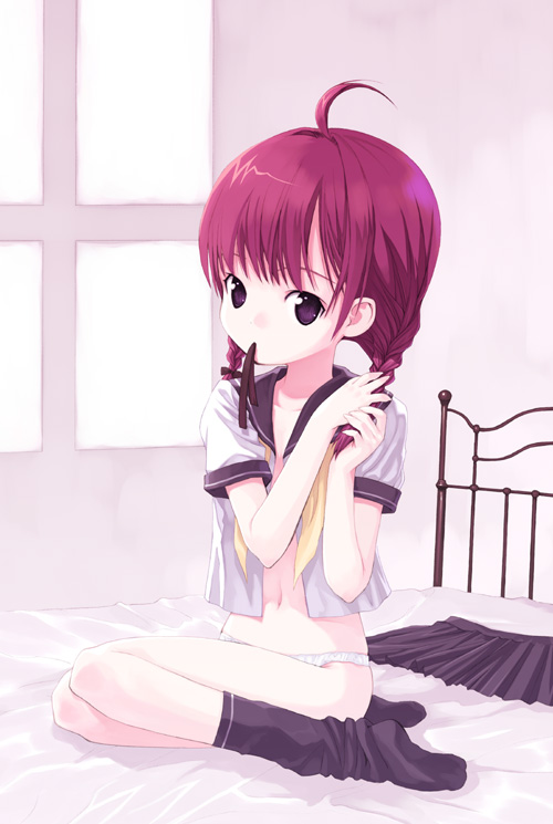 1girlahogebedbraidbraiding hairchilddressingfemale focushairdressingpantiesred hairschool uniformsockssolotwin braidsunderwear