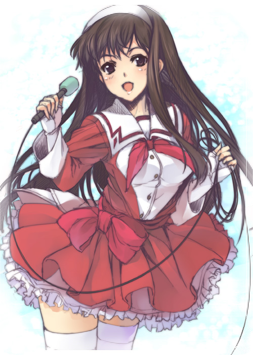 brown eyesbrown hairdressfrillshairbandheadbandlingerielong hairmicrophonepetticoatribbonsolothighhighsunderwearwhite thighhighszettai ryouiki
