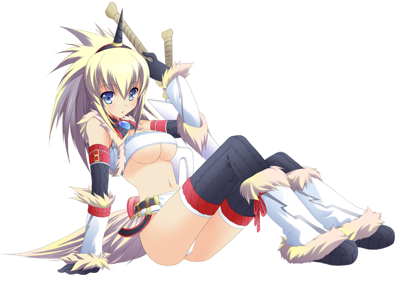 1girlbandeaubandeau bikiniblonde hairblue eyesbootsbreastsdetached sleevesfemale focushornskirin (armor)long hairmidriffpantiespantyshotsingle hornsolostraplessswordthighhighstube topunderboobunderwearweapon