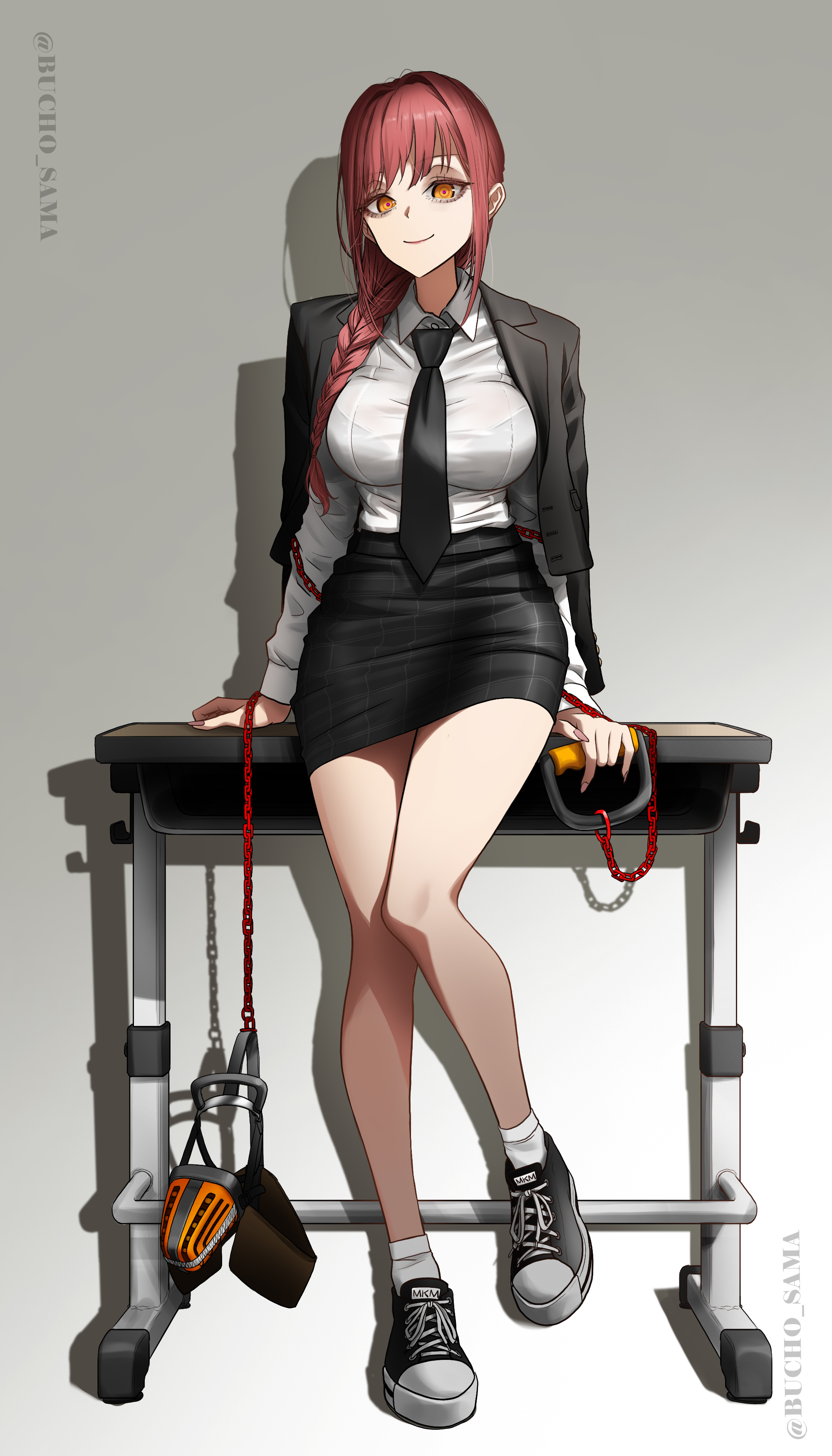 1girlblack jacketblack necktieblack skirtbreastsclosed mouthcollared shirtdeskholdingholding leashjacketleashmedium breastsminiskirtmuzzle (mask)necktieon deskred hairringed eyesschool deskschool uniformshirtshoessittingskirtsmilesneakerssolowhite shirtyellow eyes