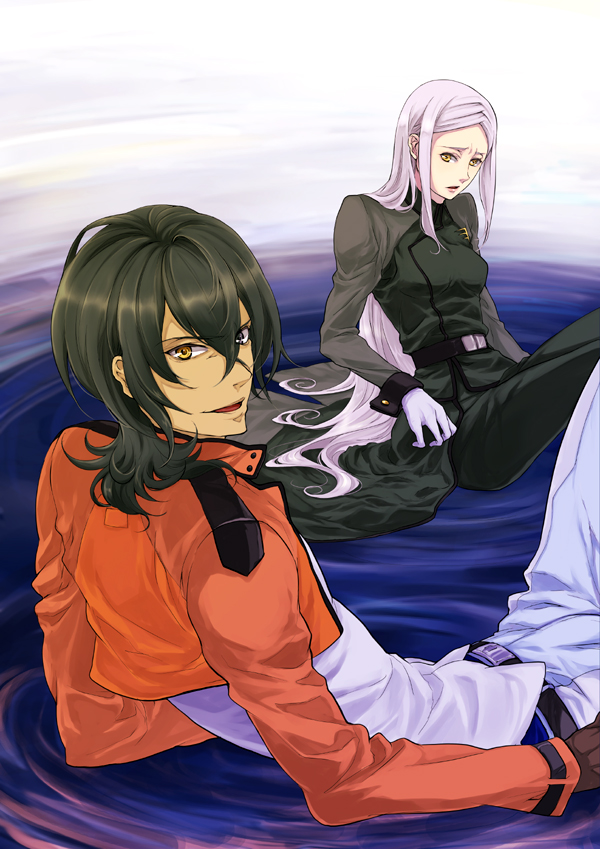 kondoru, original, bad id, bad pixiv id, 1boy, 1girl, boots, gloves, greyscale, military, military uniform, monochrome, naval uniform, necktie, short hair, smile, sword, weapon