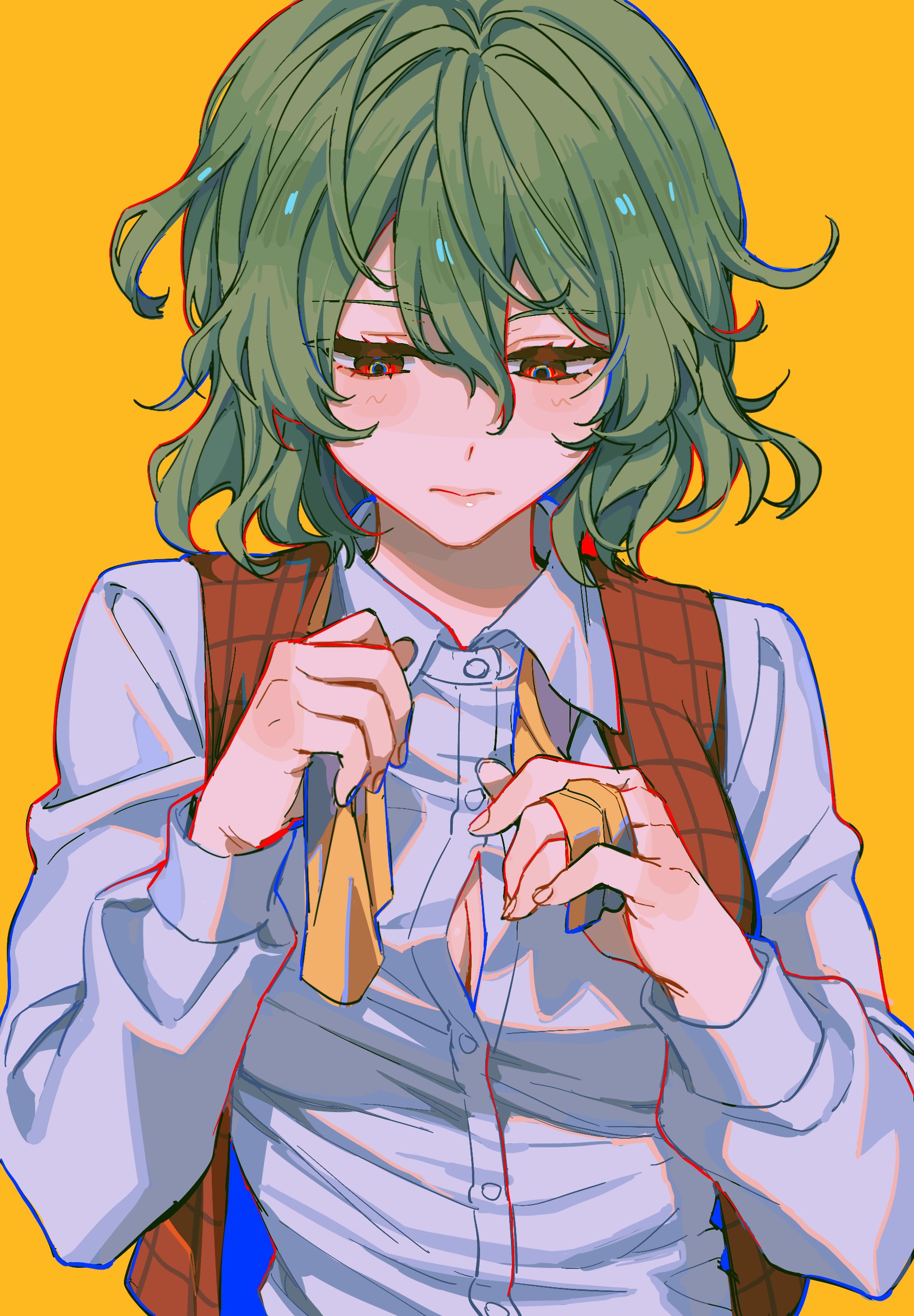 1girlascotblushbreastsclosed mouthcollared shirtgreen hairlong sleevesplaid clothesplaid vestred eyesred vestshirtshort hairsimple backgroundsolovestwhite shirtyellow background