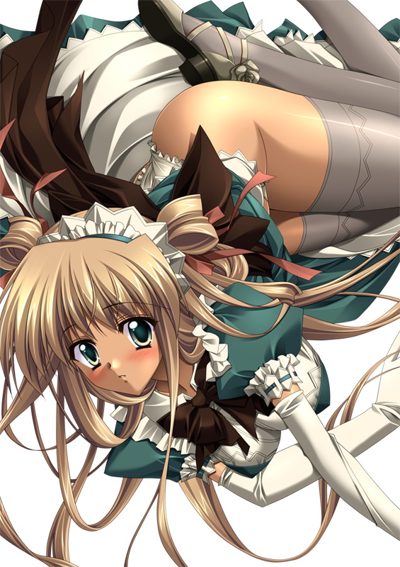 mizuki (4985964), emilia (re:zero), alice fiction, re:zero kara hajimeru isekai seikatsu, official art, 1girl, bare shoulders, blue pupils, braid, breasts, cleavage, crossover, crown braid, dress, elf, english text, flower, food, gem, green gemstone, hair flower, hair ornament, hair ribbon, long hair, outdoors, pointy ears, purple eyes, purple ribbon, ribbon, rose, solo, thighhighs, white flower, white hair, white rose, x hair ornament